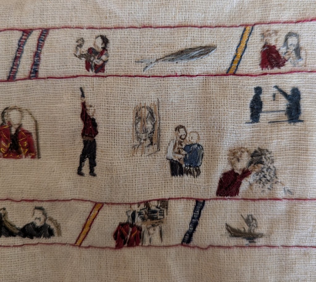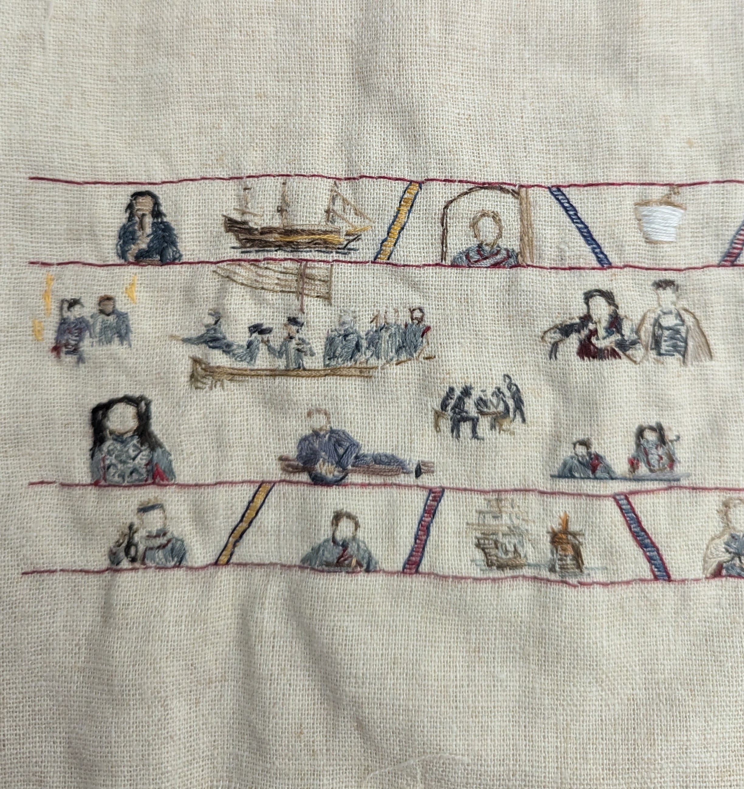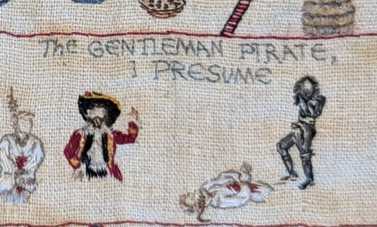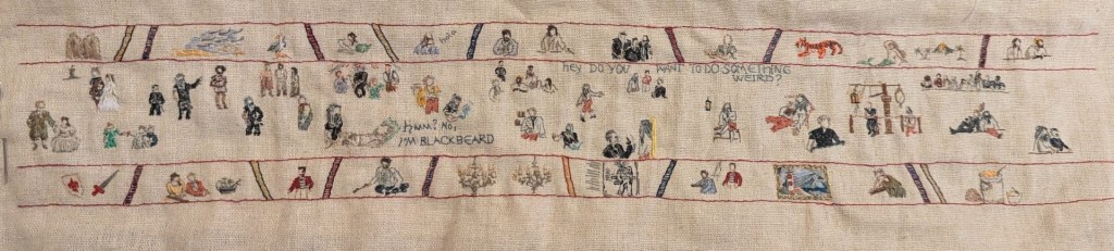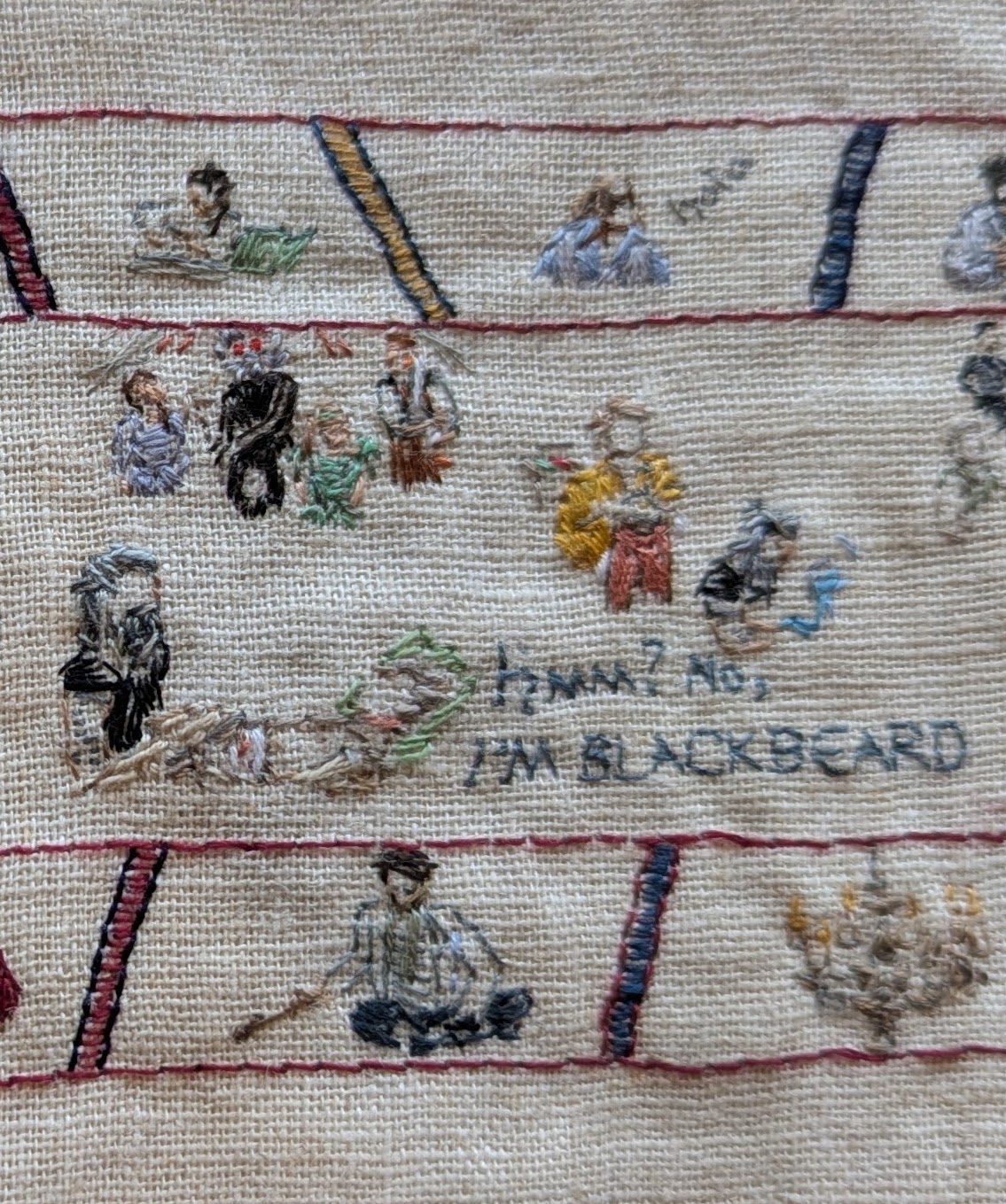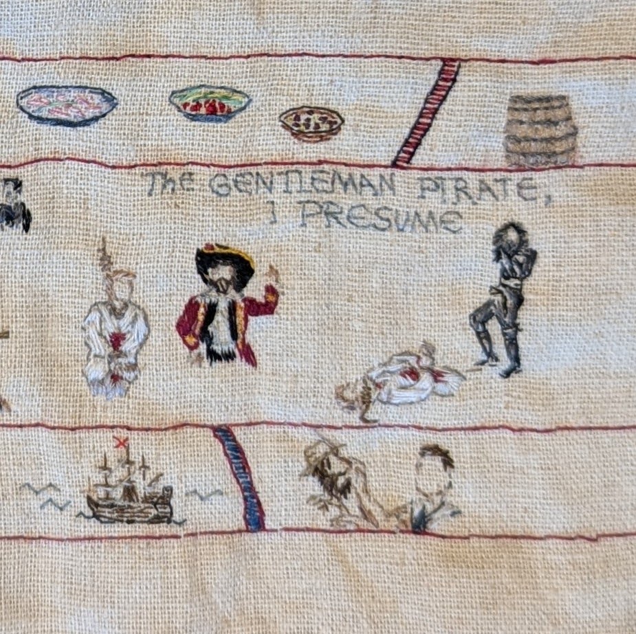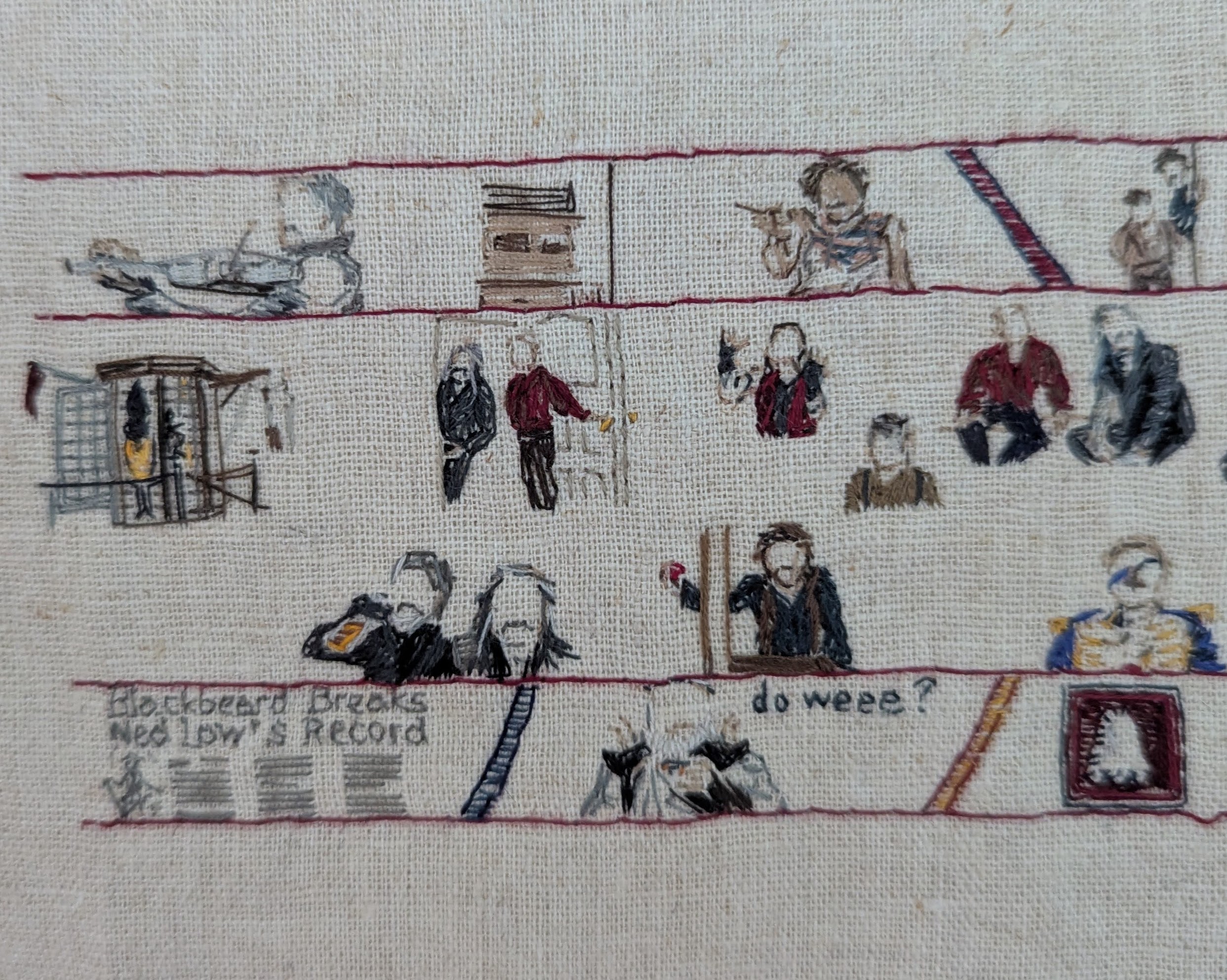 An embroidery in the (sort of) style of the Bayeux Tapestry. Only tiny. Based on the wonderful Our Flag Means Death.