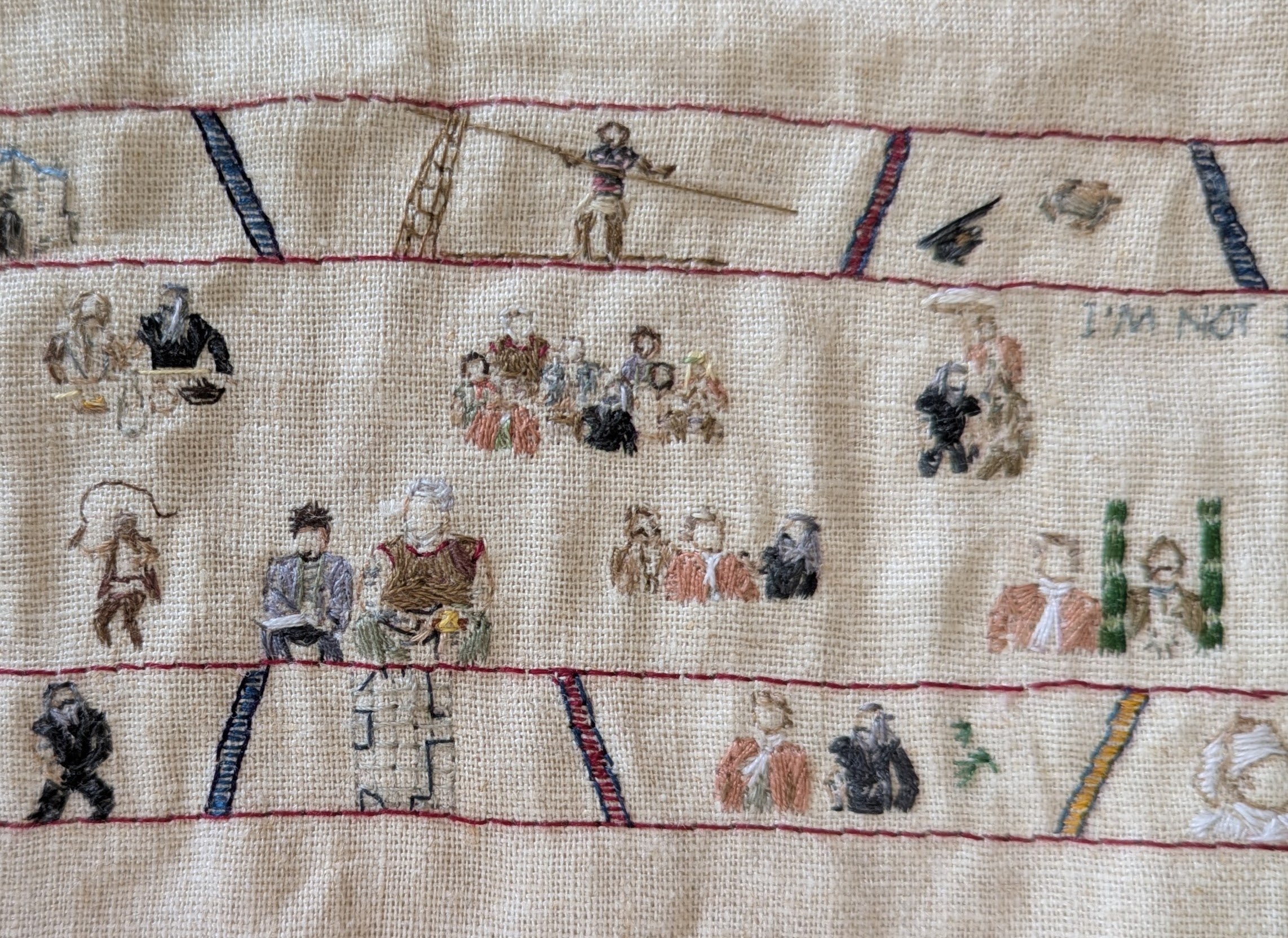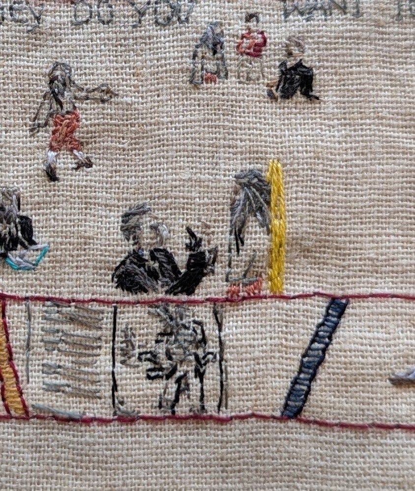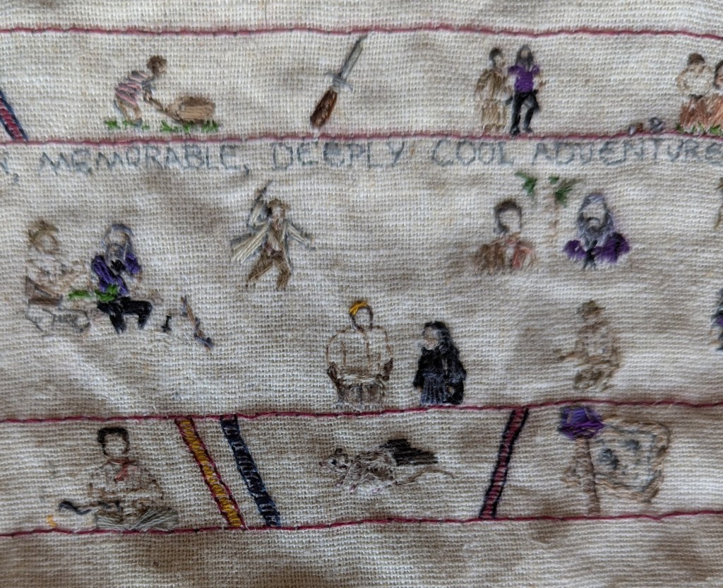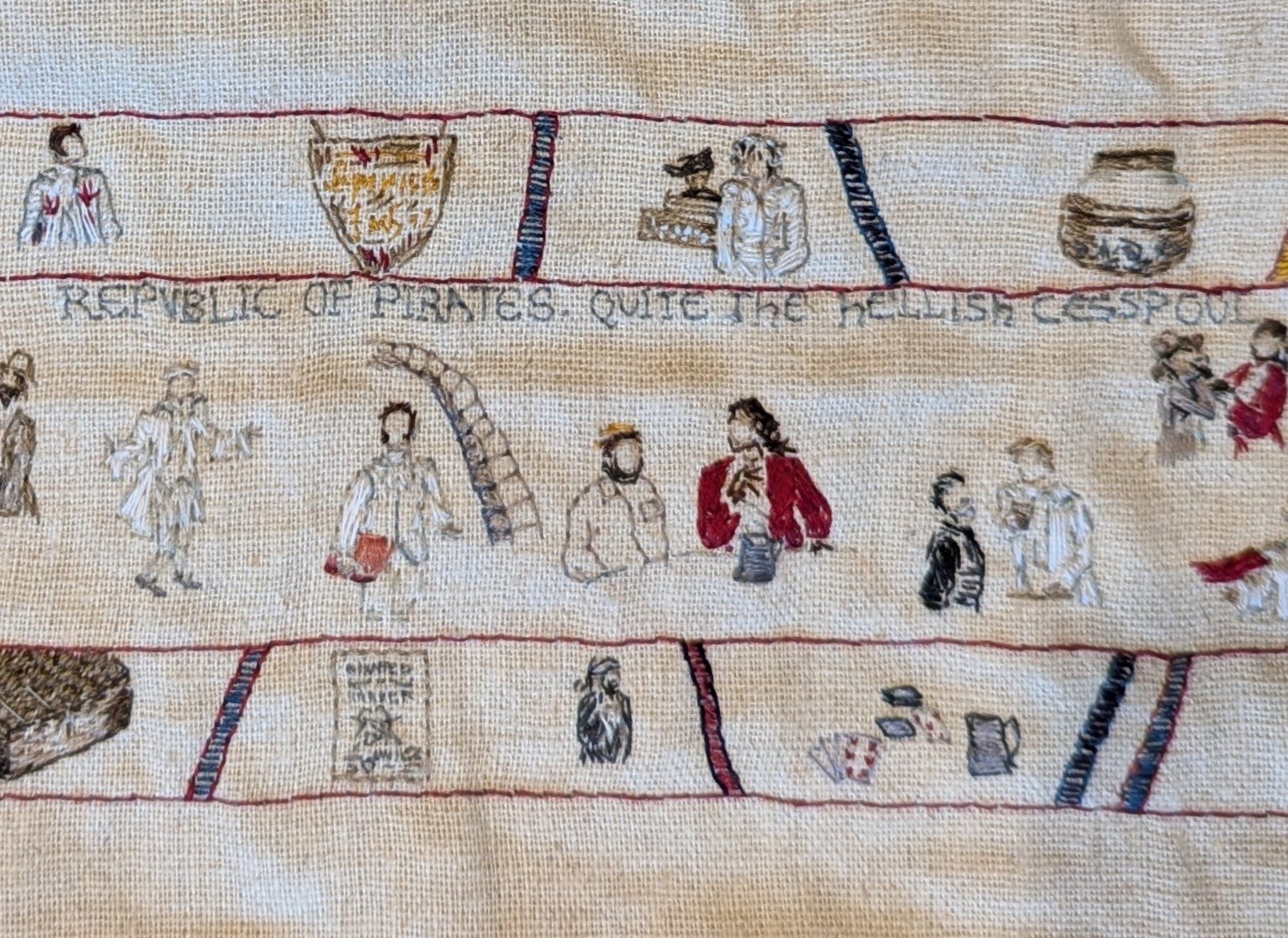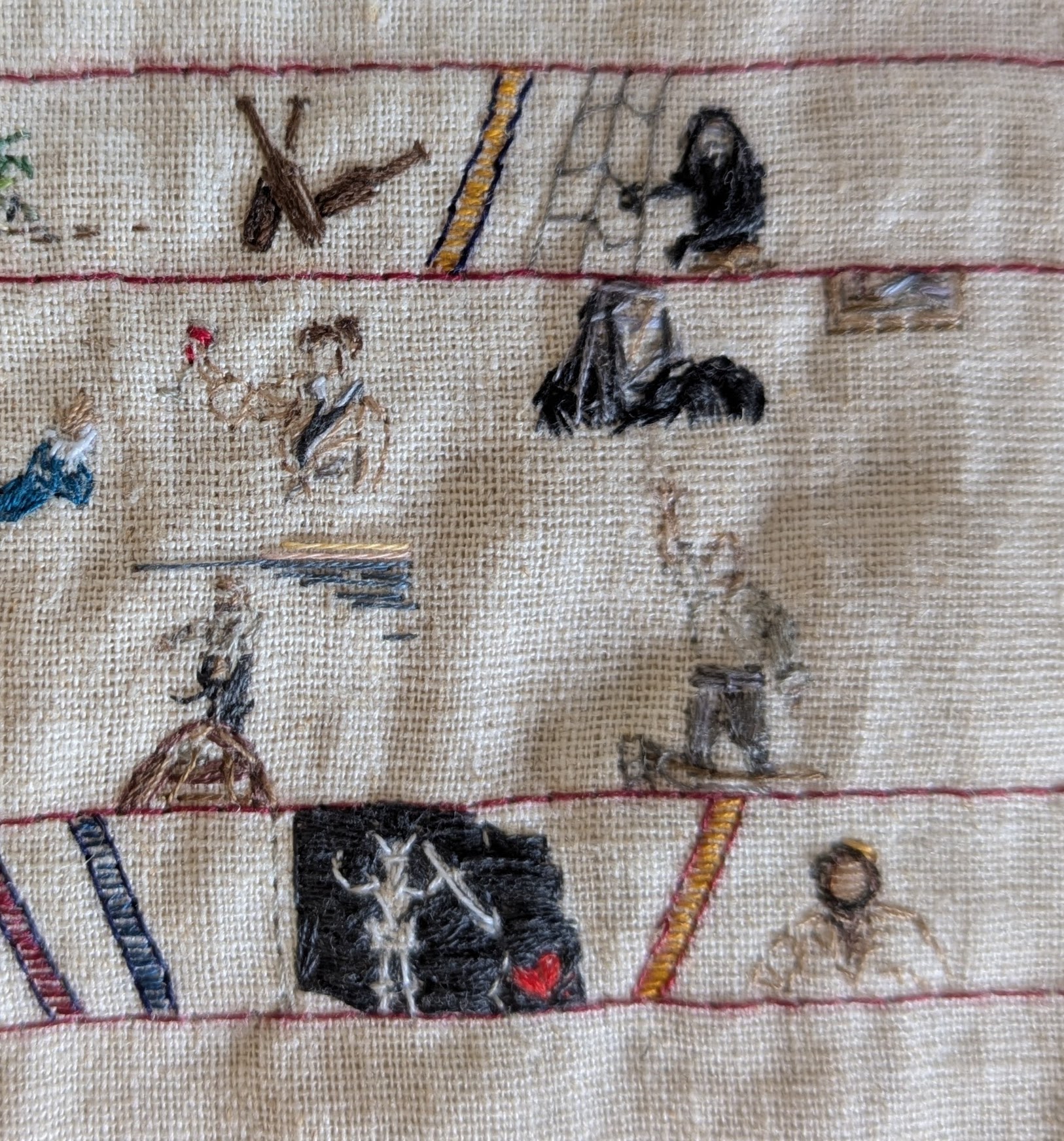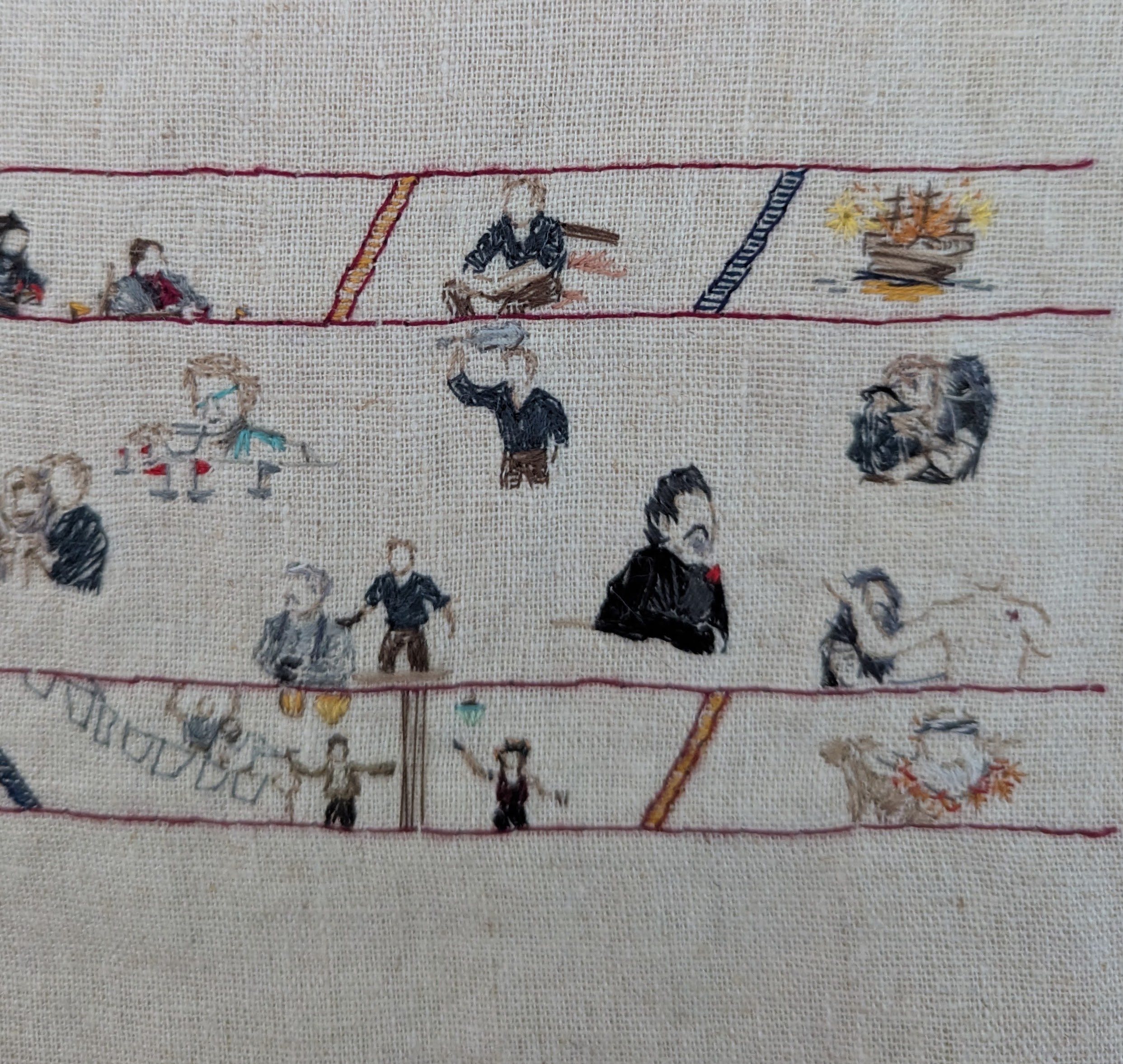 An embroidery in the (sort of) style of the Bayeux Tapestry. Only tiny. Based on the wonderful Our Flag Means Death.