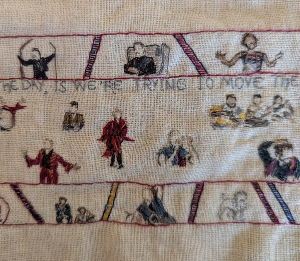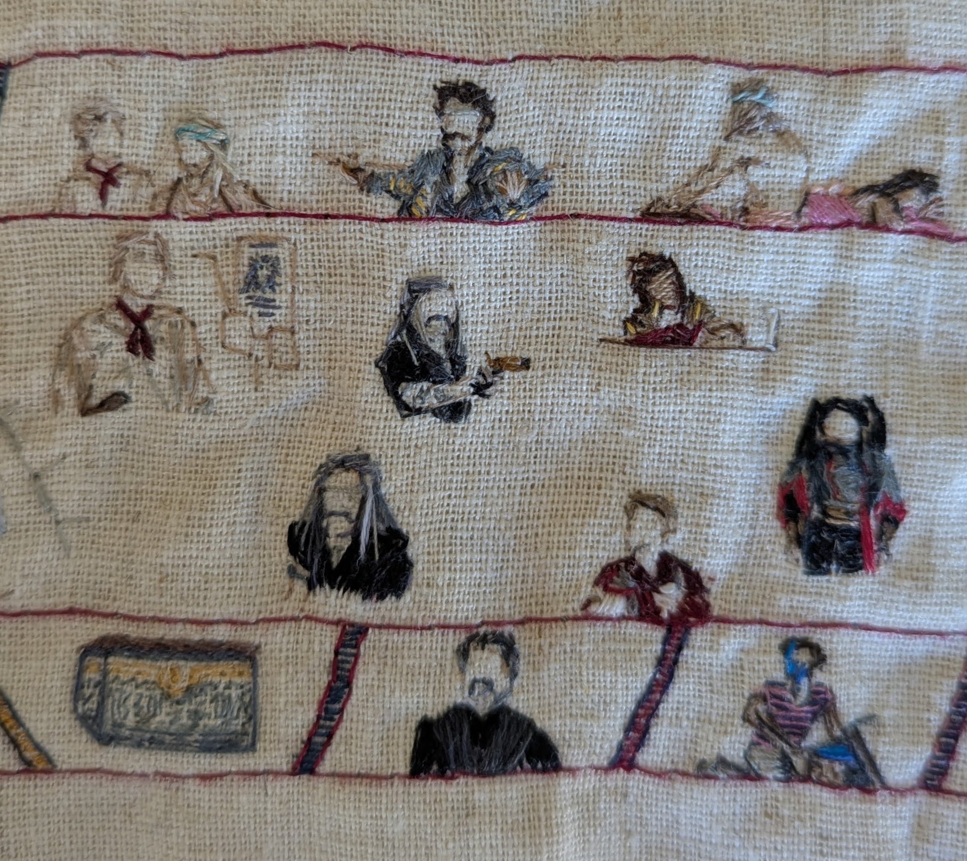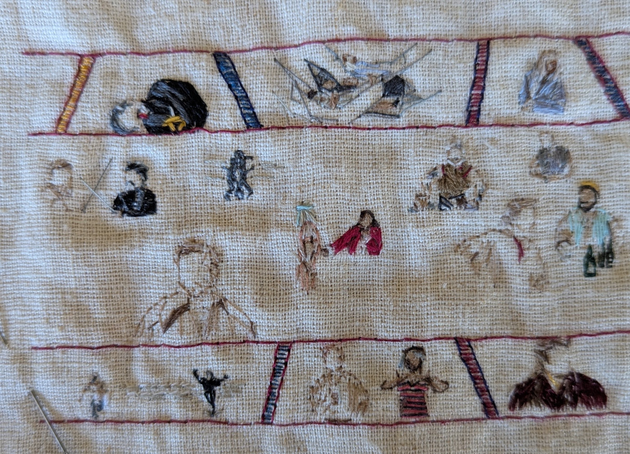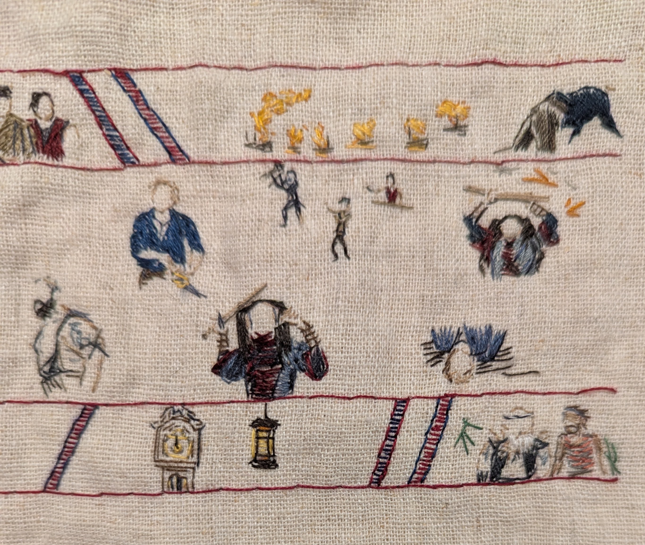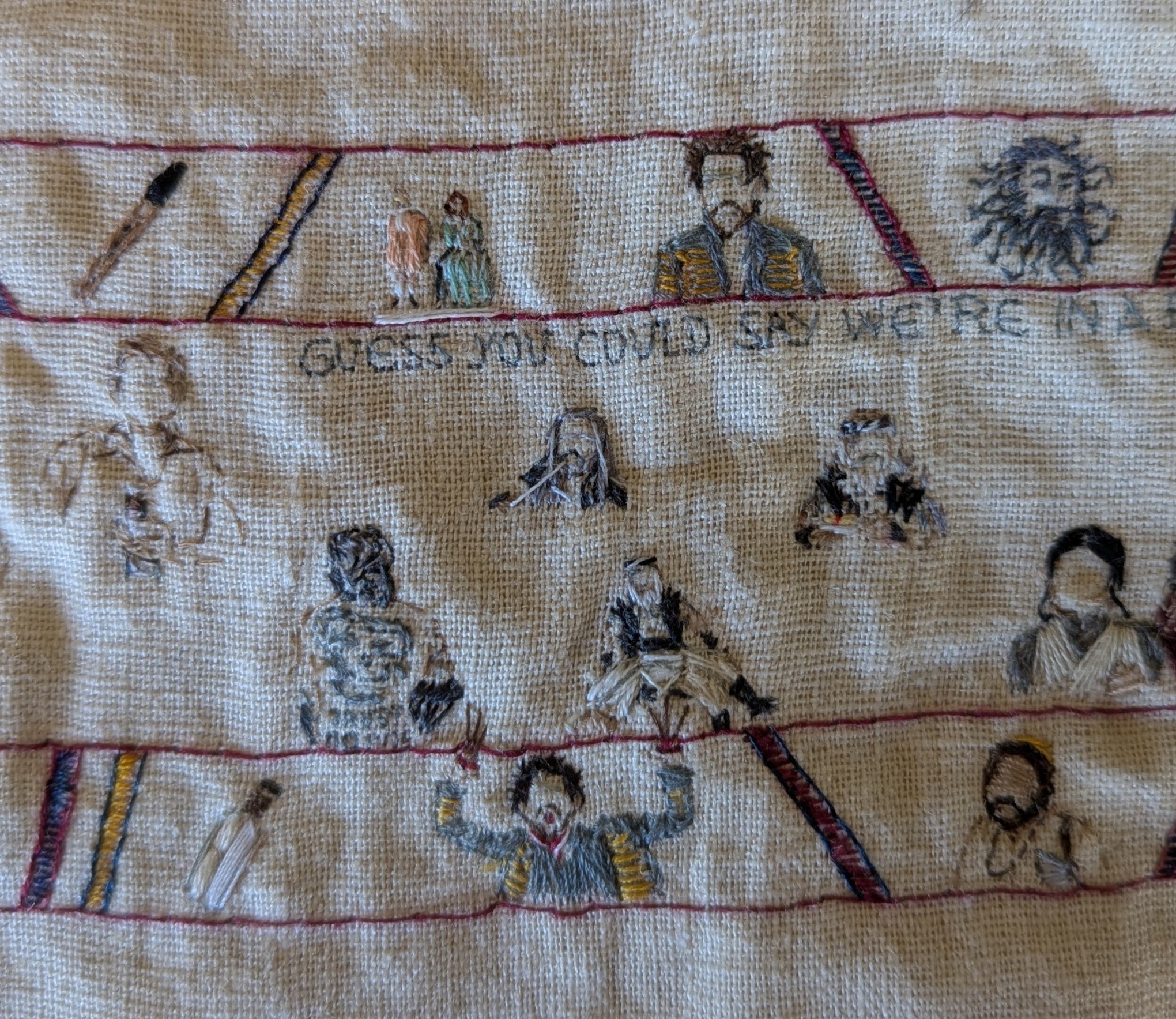 An embroidery in the (sort of) style of the Bayeux Tapestry. Only tiny. Based on the wonderful Our Flag Means Death.