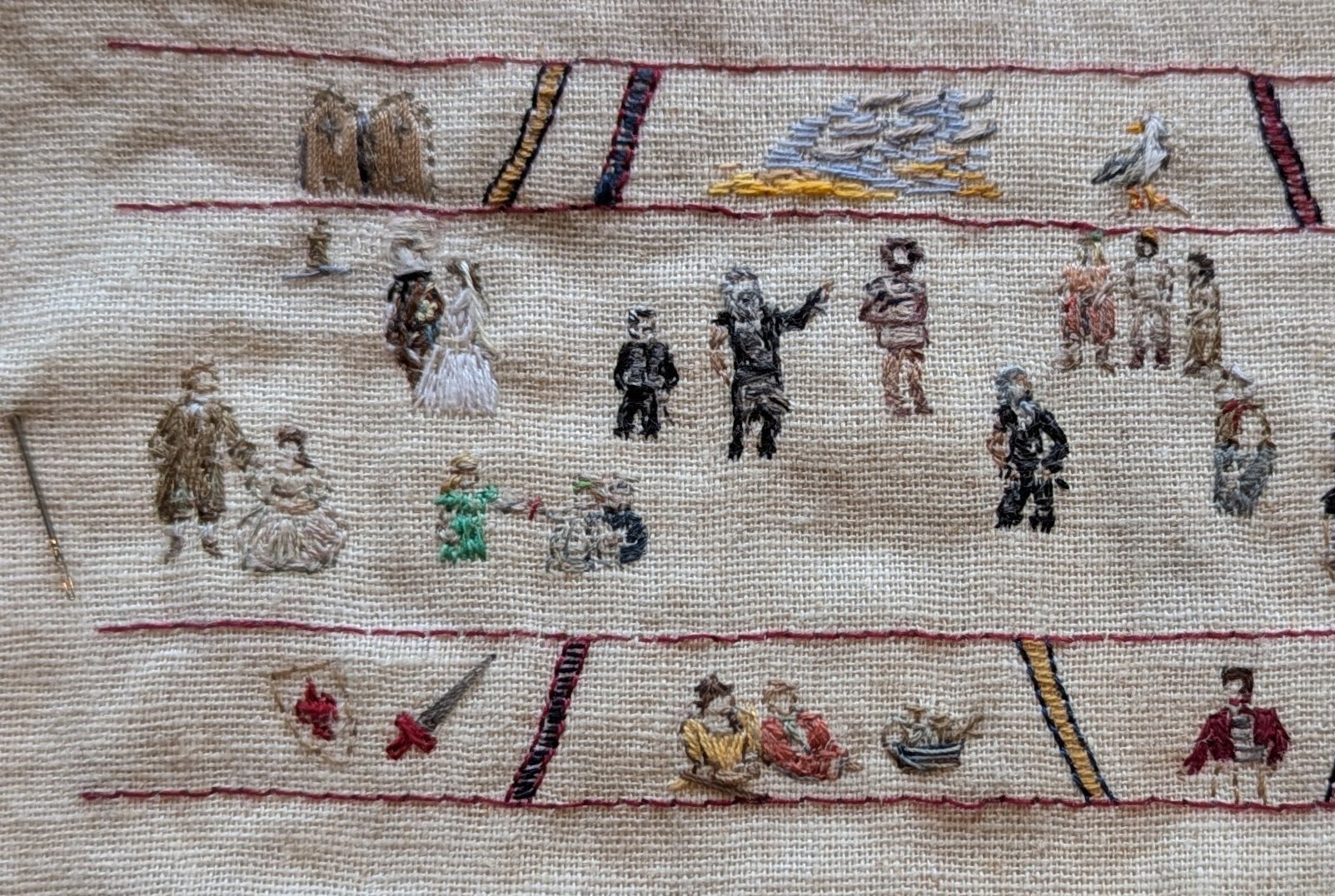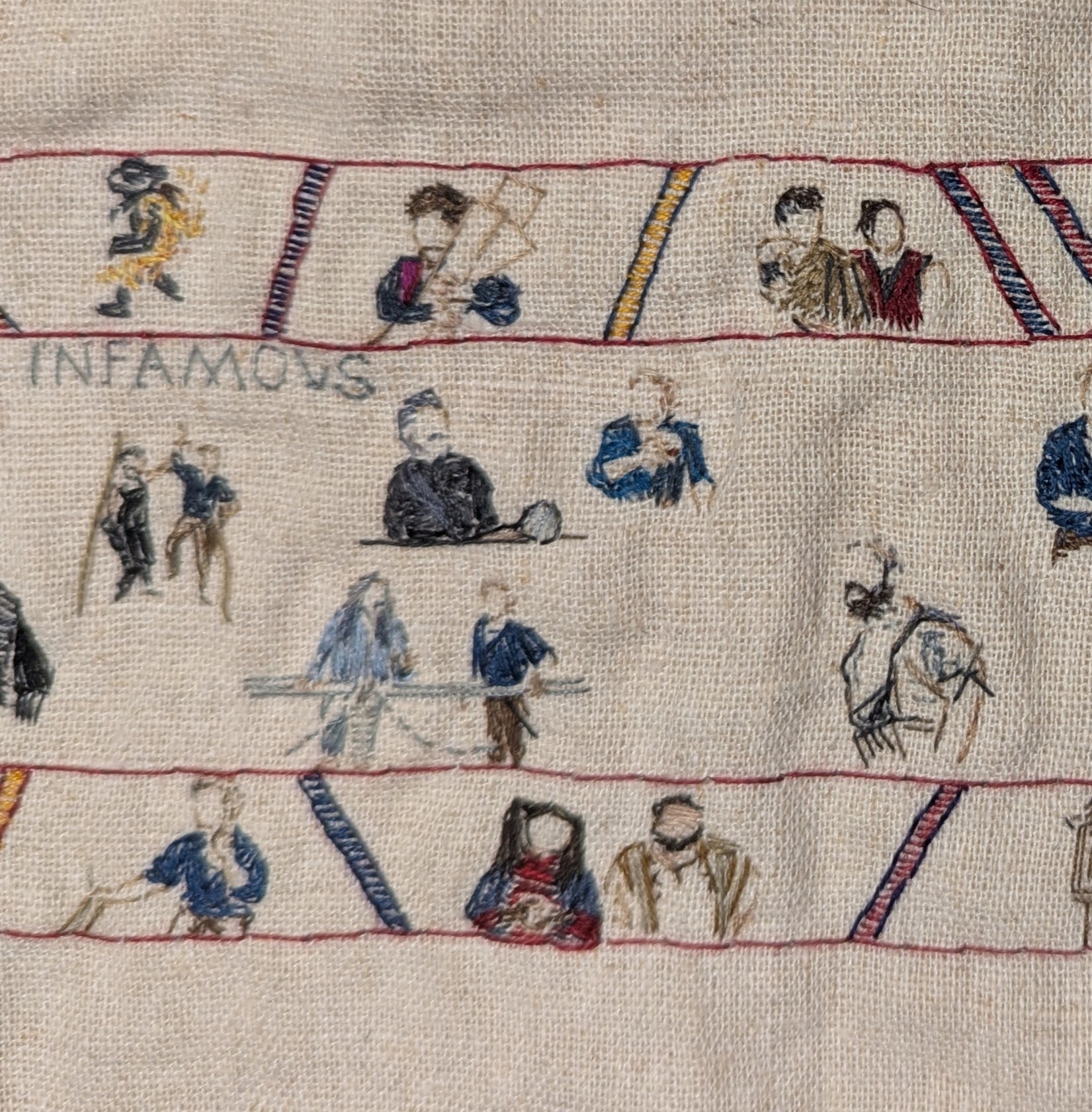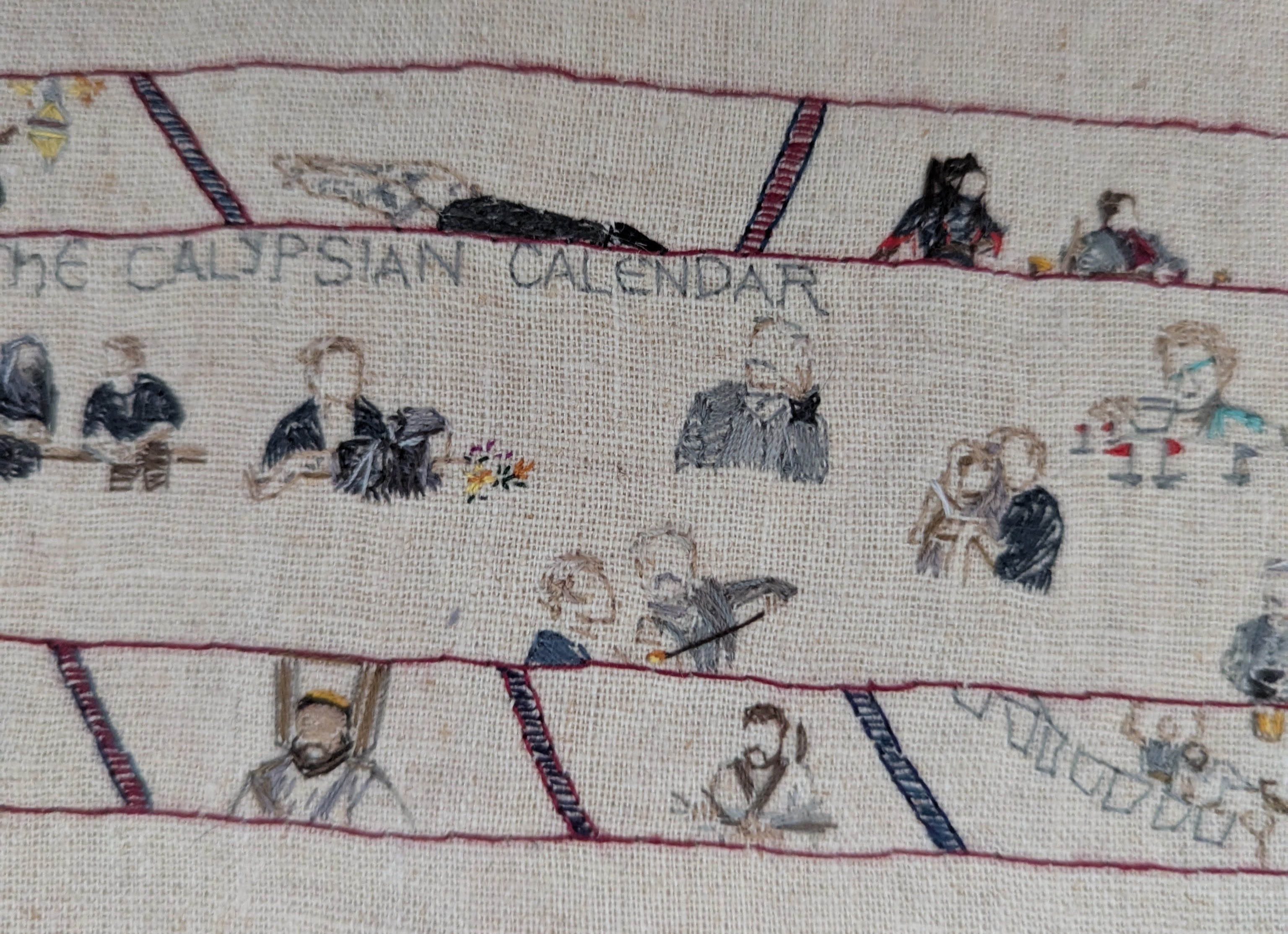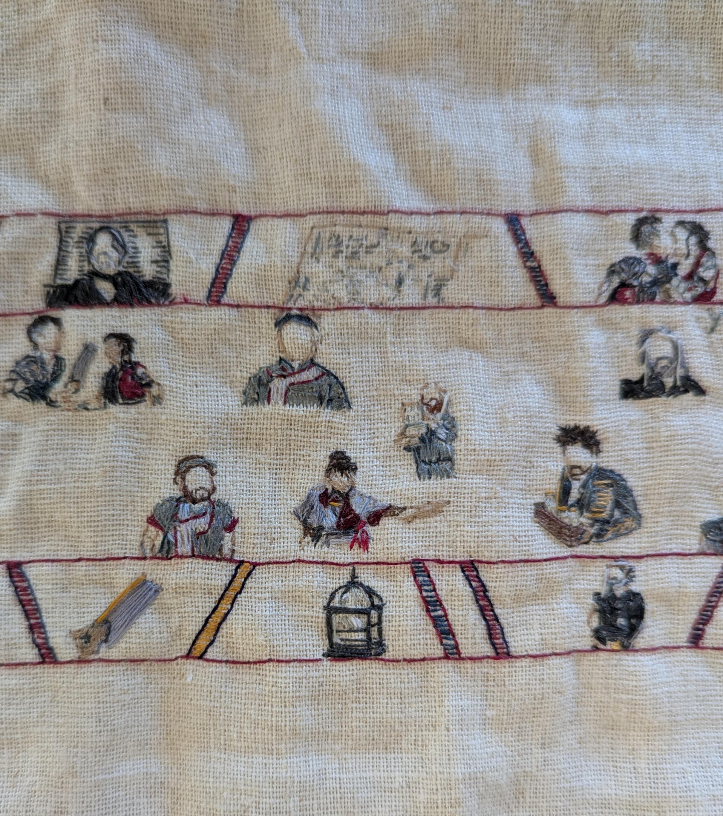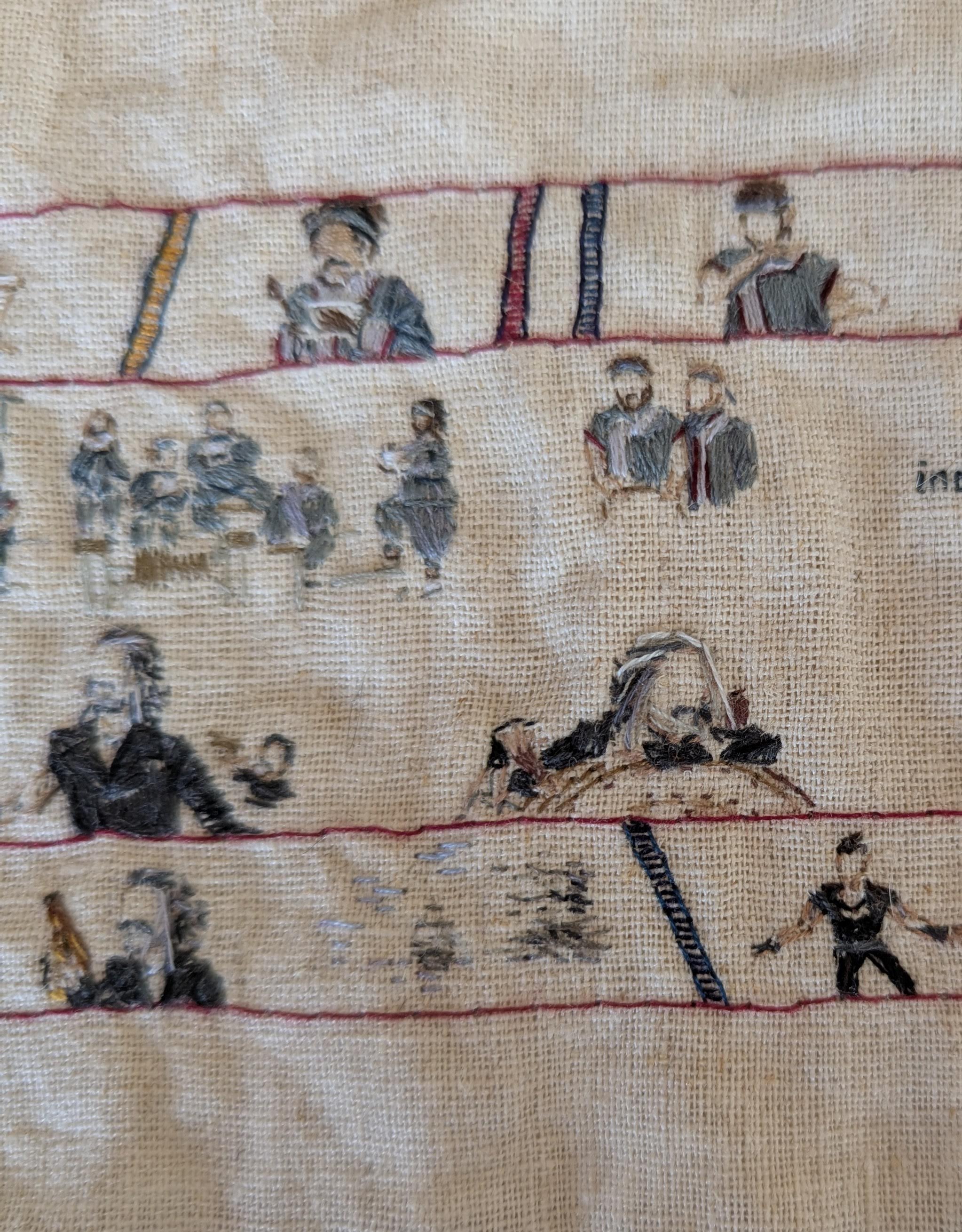 An embroidery in the (sort of) style of the Bayeux Tapestry. Only tiny. Based on the wonderful Our Flag Means Death.