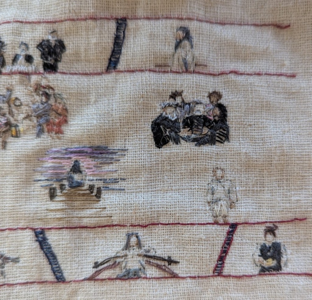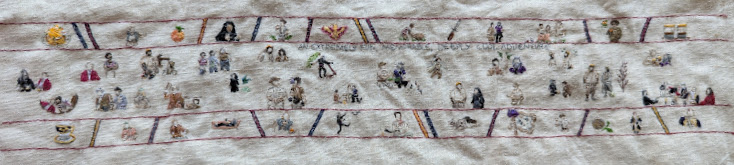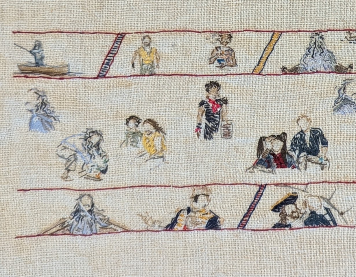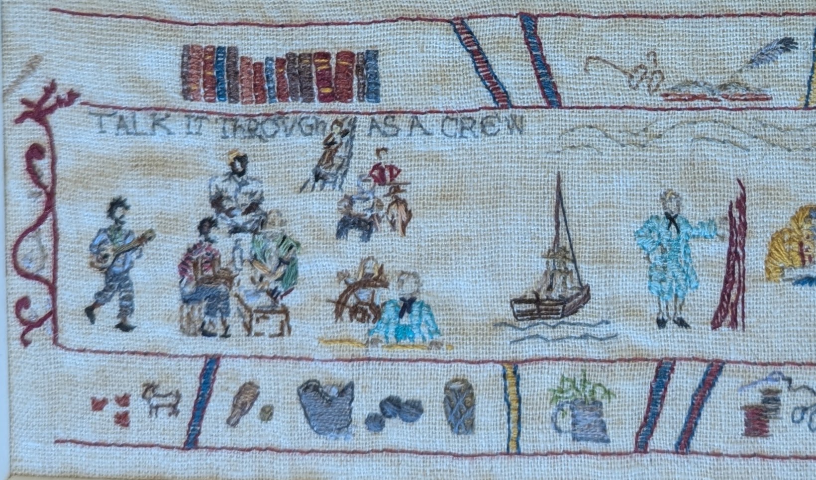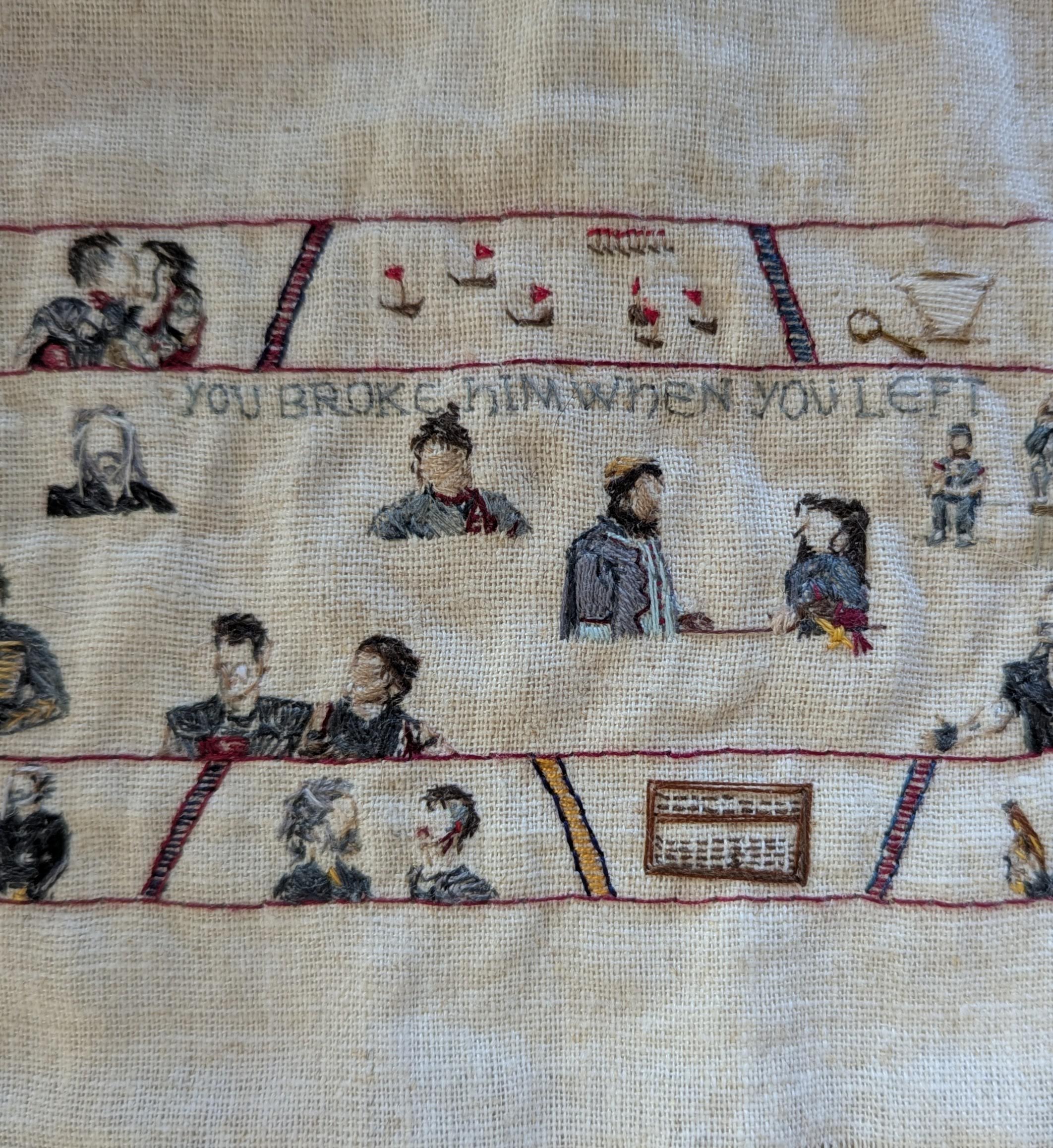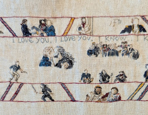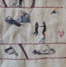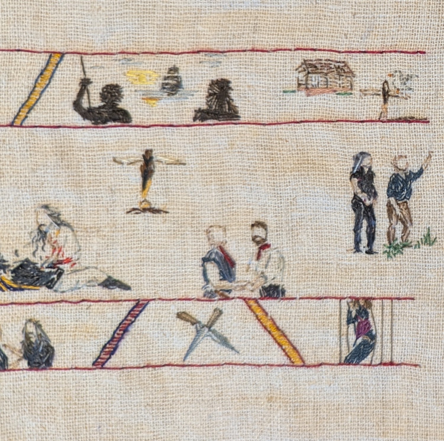 An embroidery in the (sort of) style of the Bayeux Tapestry. Only tiny. Based on the wonderful Our Flag Means Death.