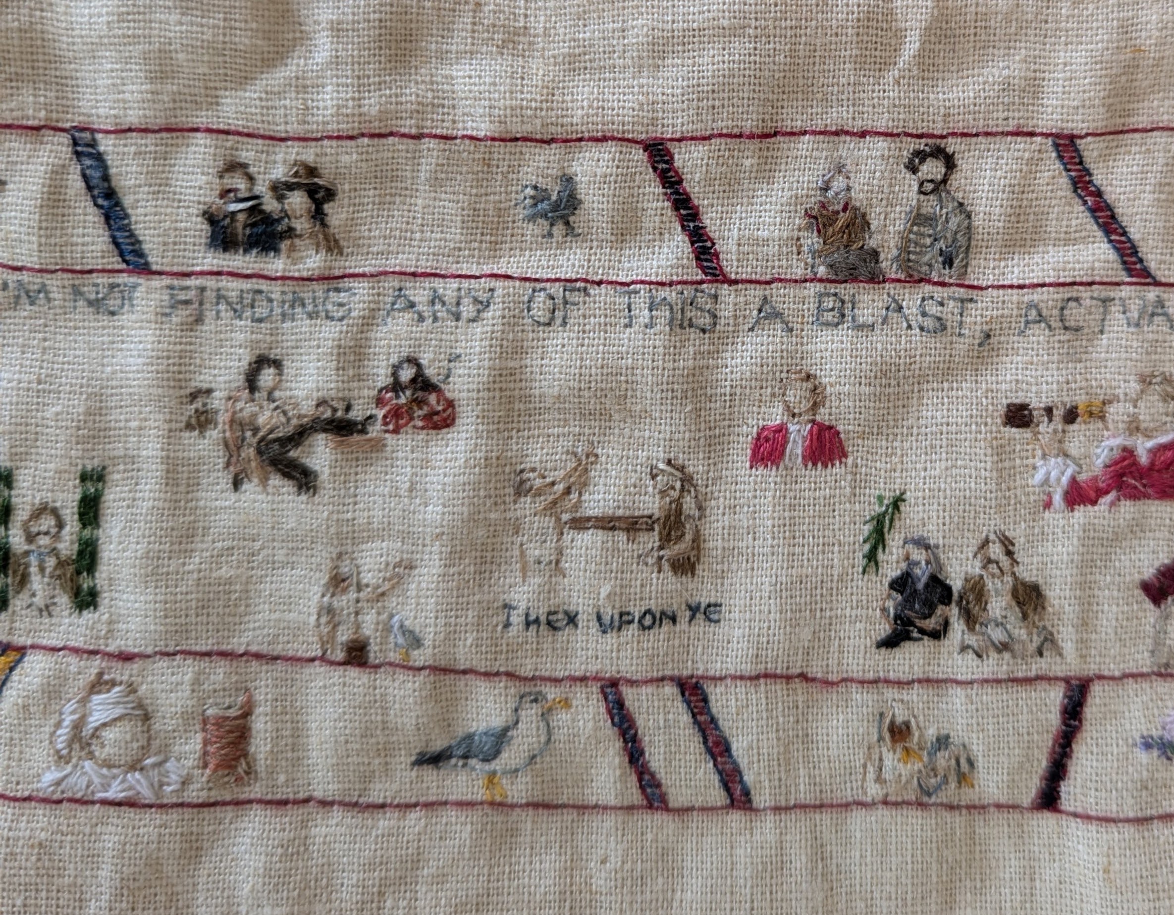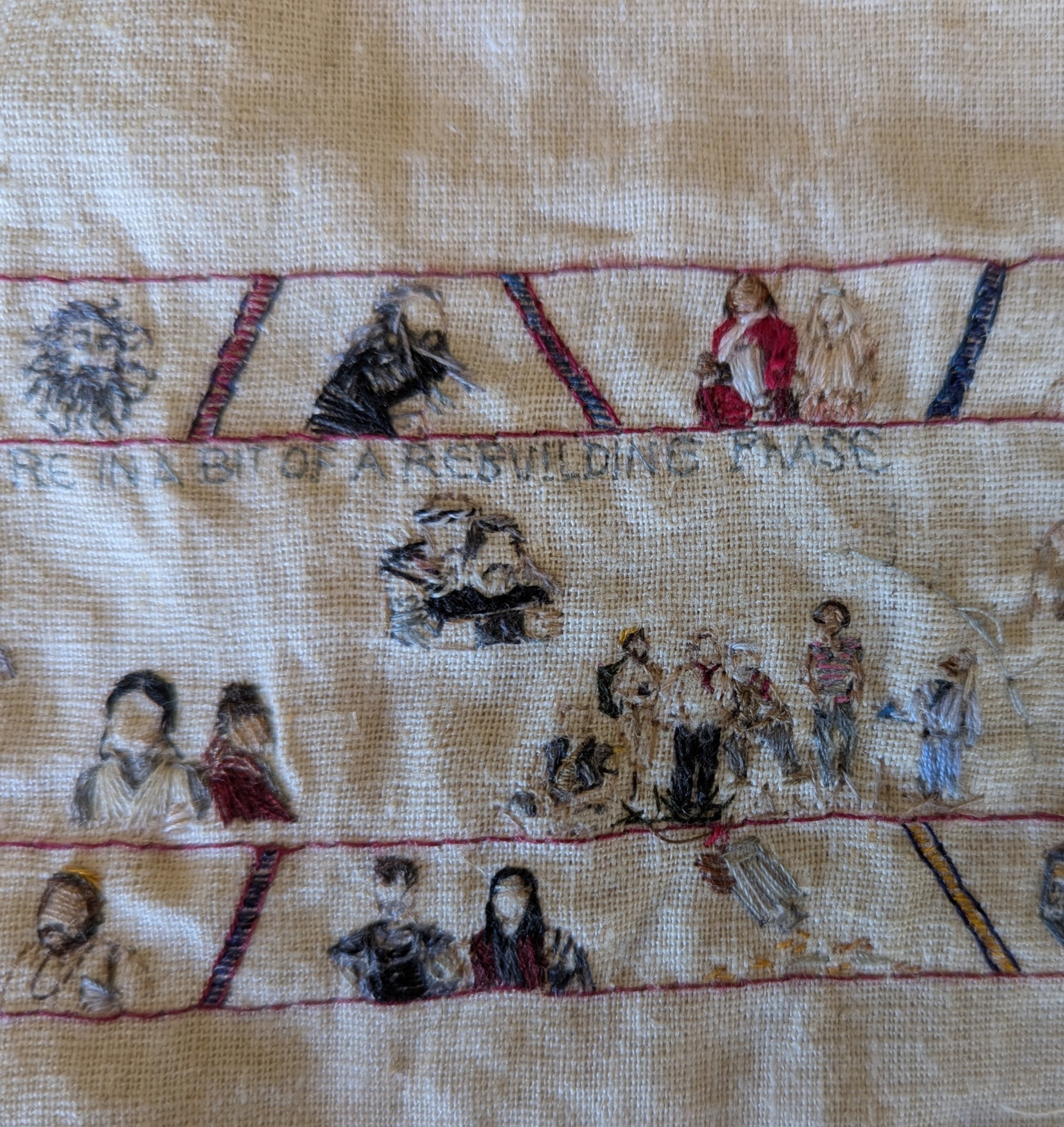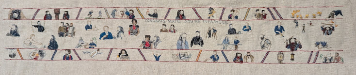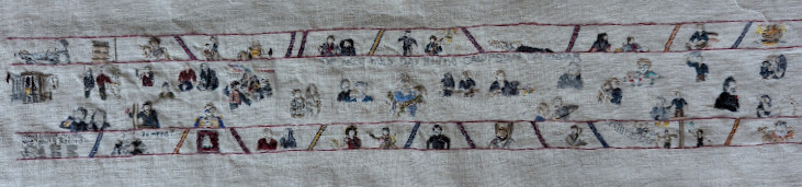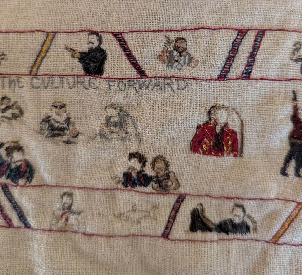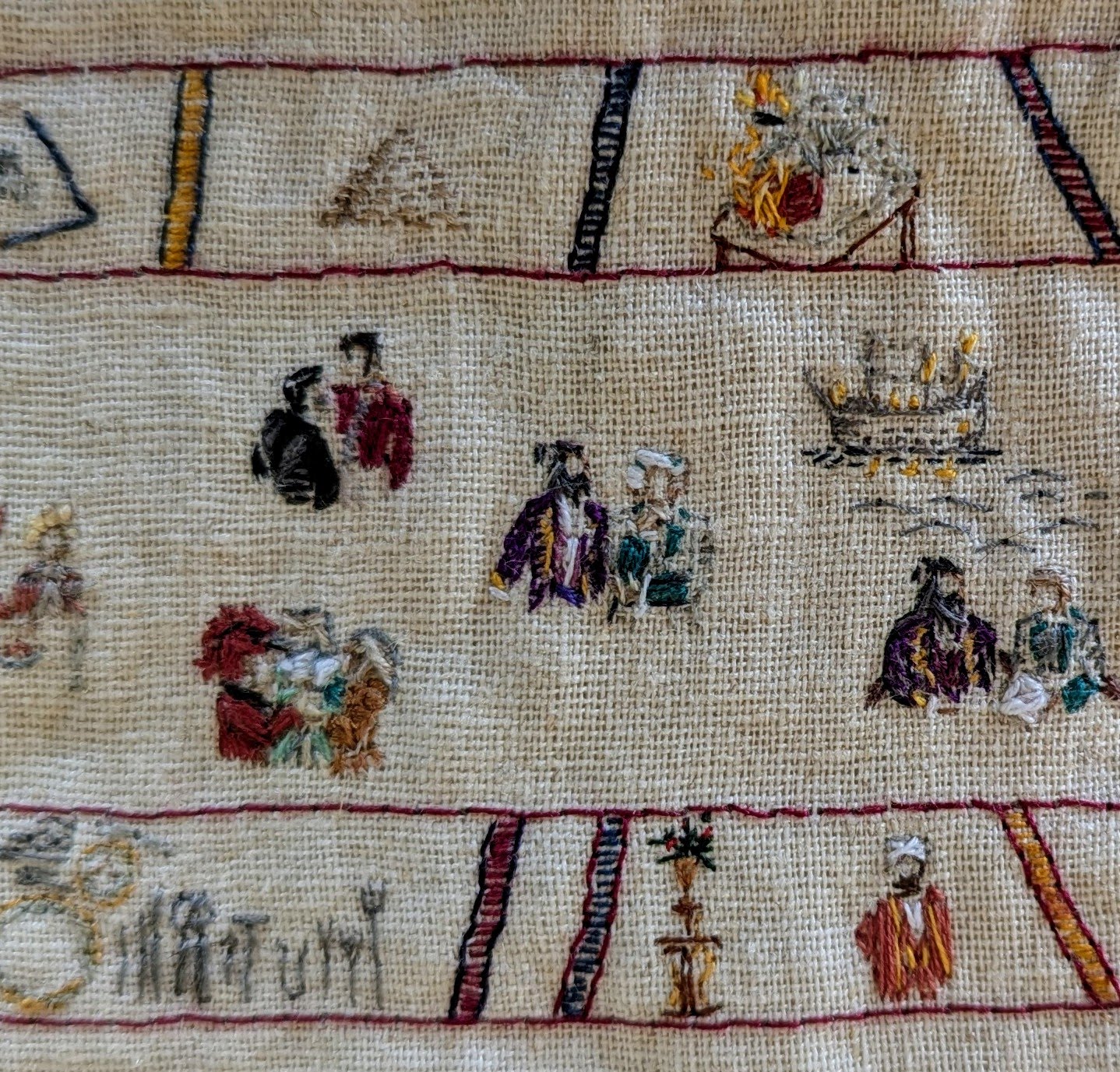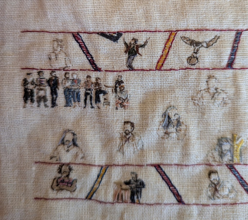 An embroidery in the (sort of) style of the Bayeux Tapestry. Only tiny. Based on the wonderful Our Flag Means Death.