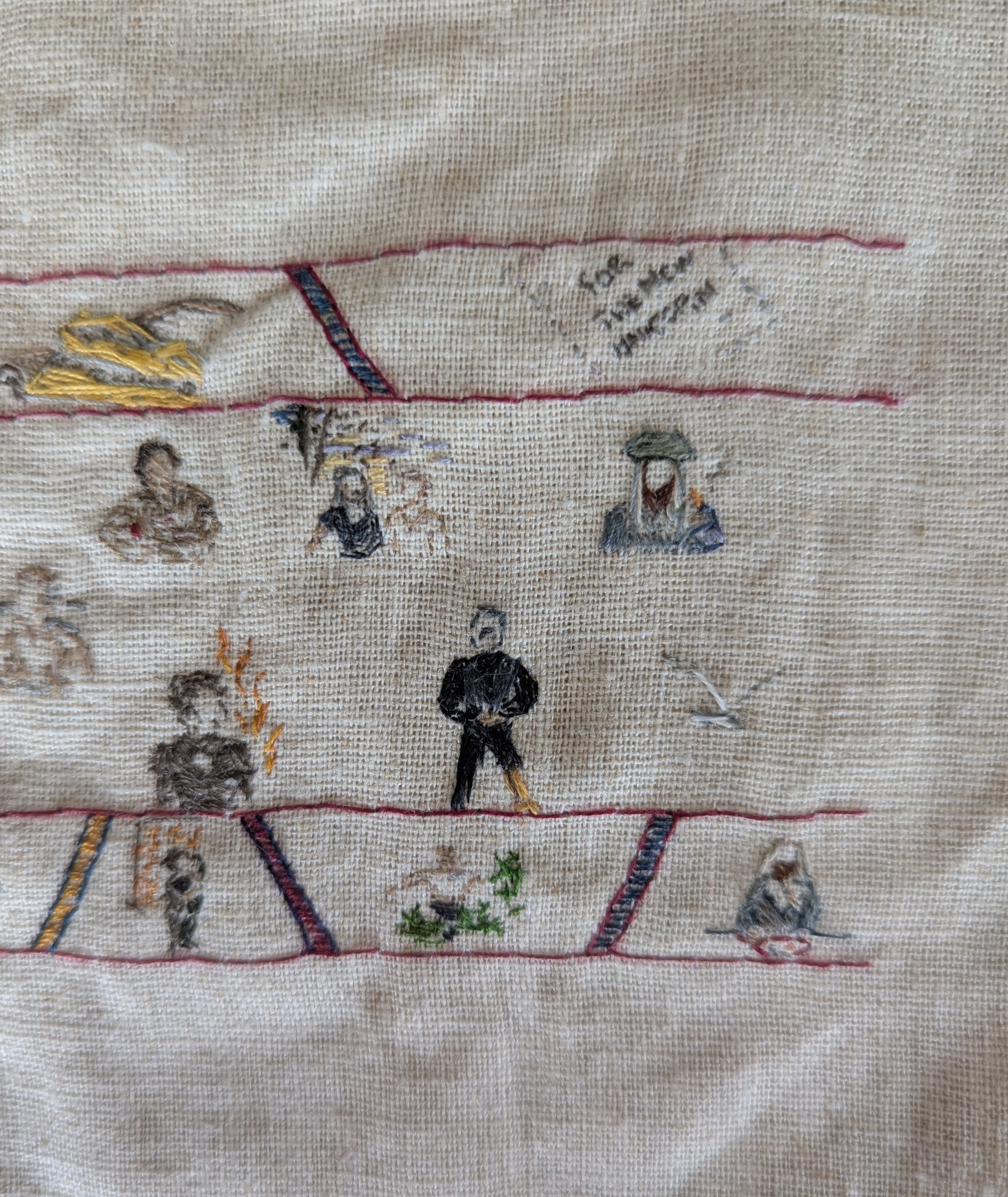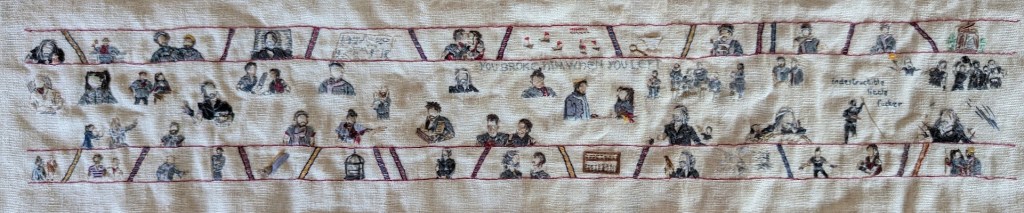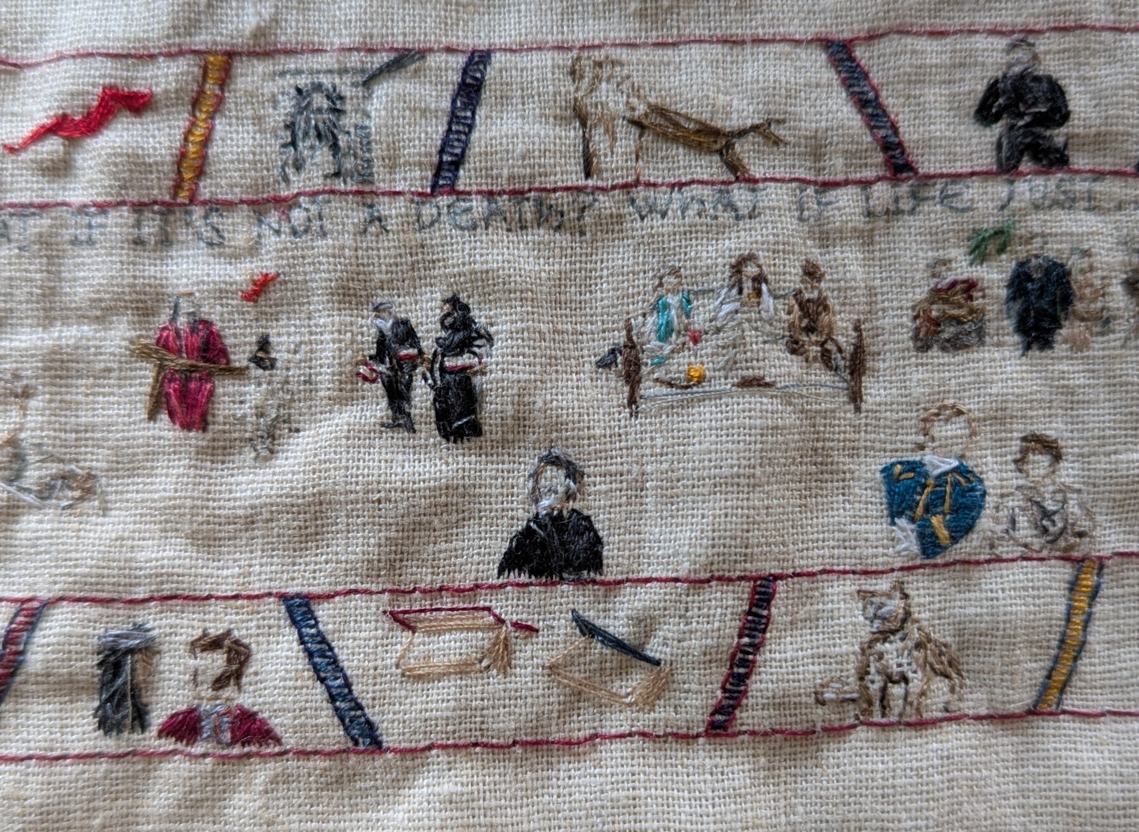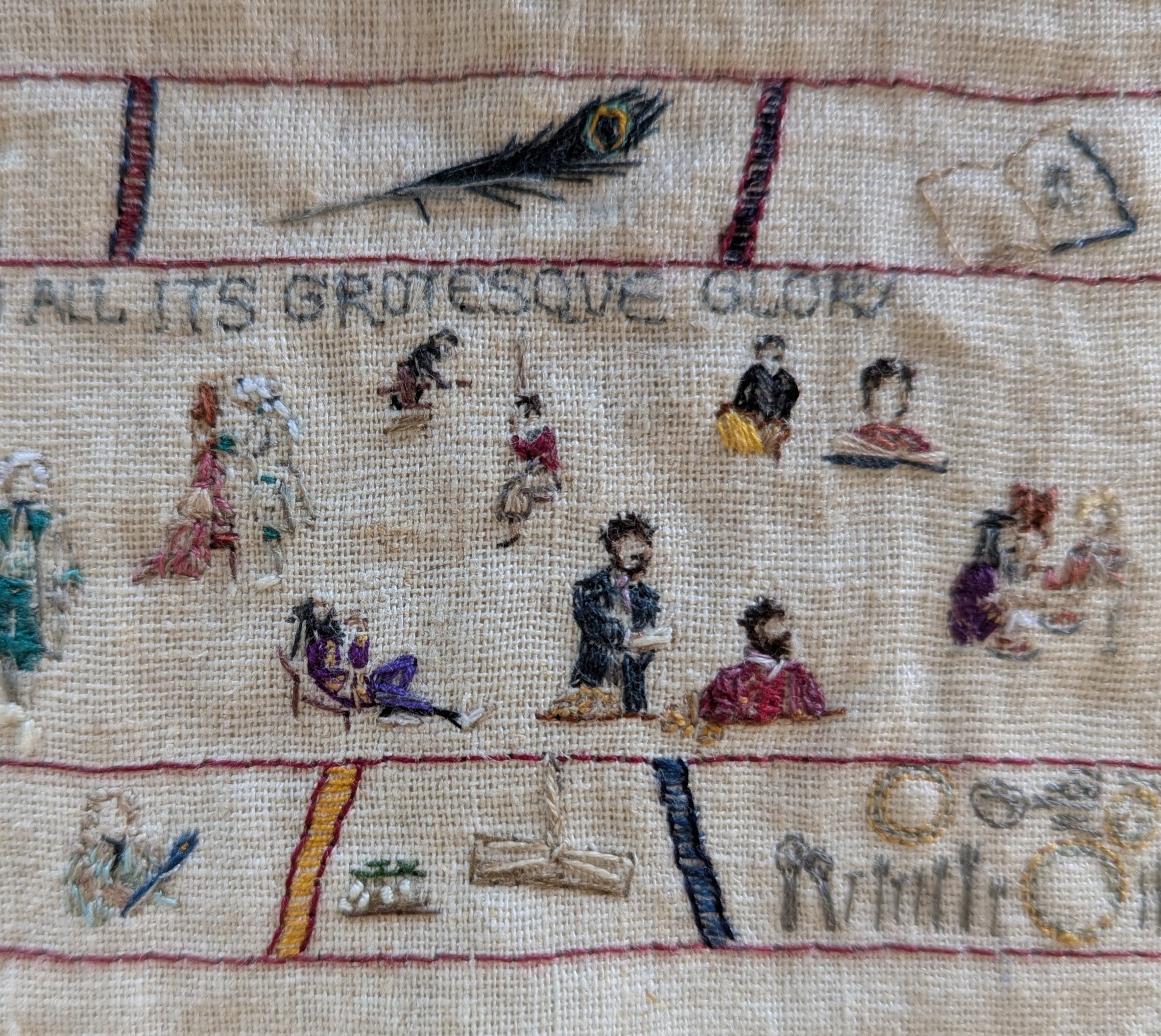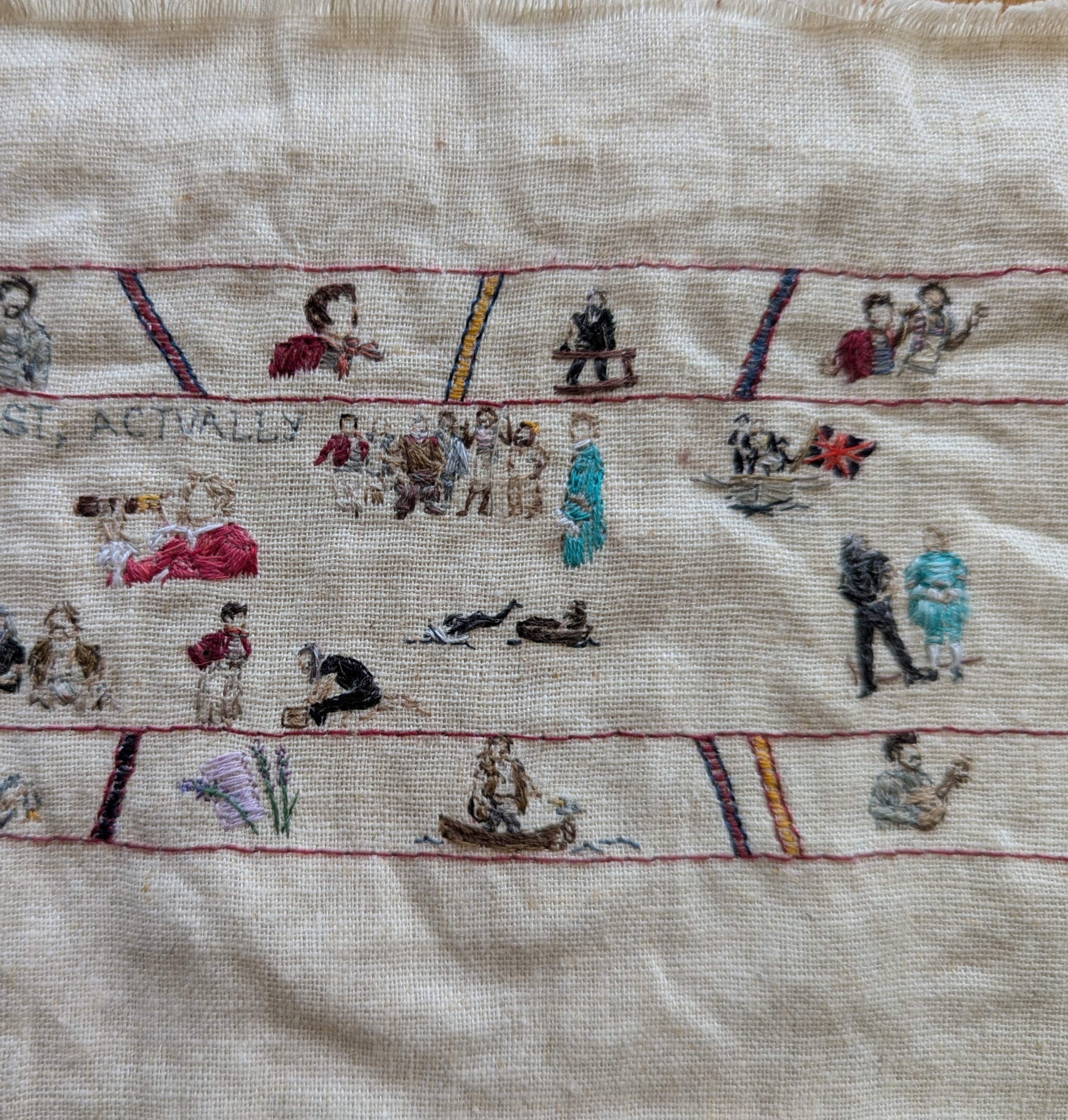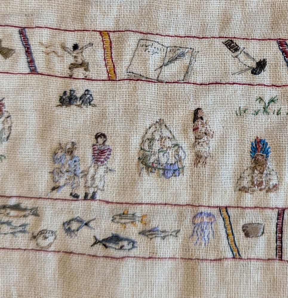 An embroidery in the (sort of) style of the Bayeux Tapestry. Only tiny. Based on the wonderful Our Flag Means Death.